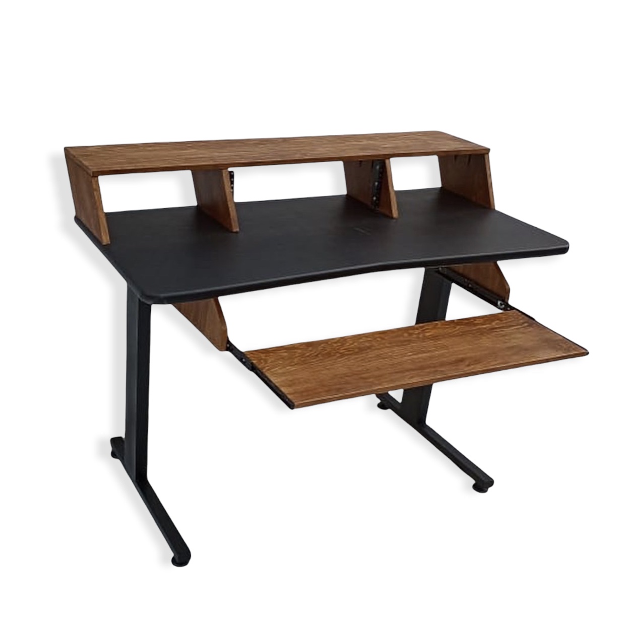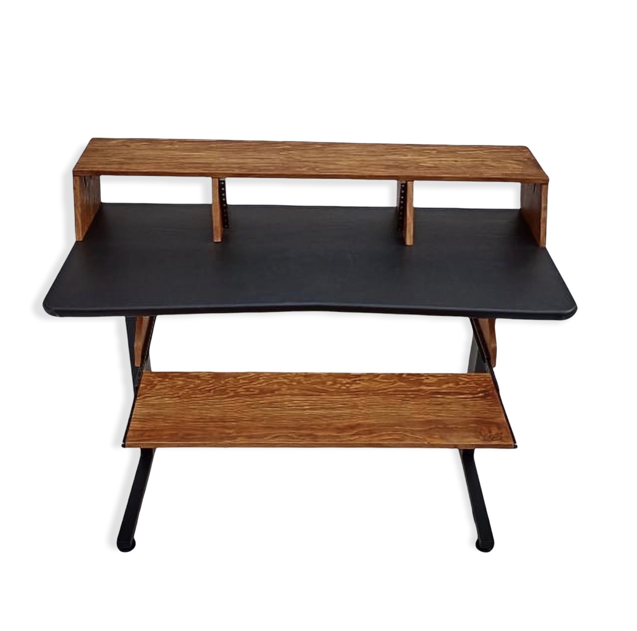 Construido en Mdf de 16mm forrado en vinil, segundo piso y deslizable en triplay de Encino entintado en tinta color Roble, terminado en poliuretano semi mate.